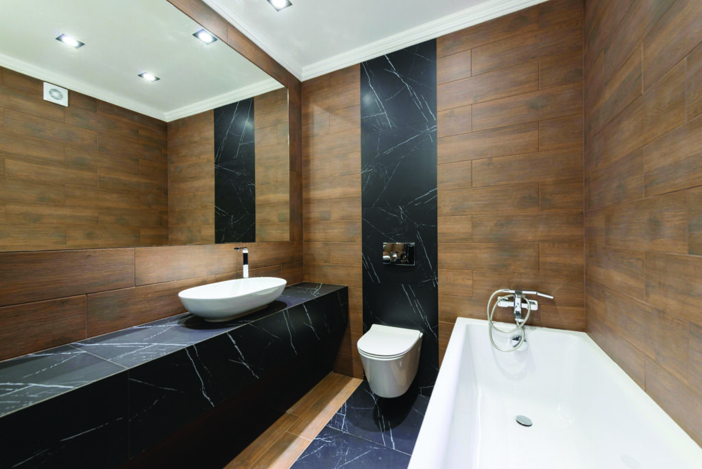 One can also introduce larger, bold marble-finish tiles. Such spaces work well with a mix of base and highlighter tiles; position highlighters to create a feature wall, for example, a shower wall that runs full-height from ceiling to floor. For floors, tile sizes up to 60×60cm perform well.